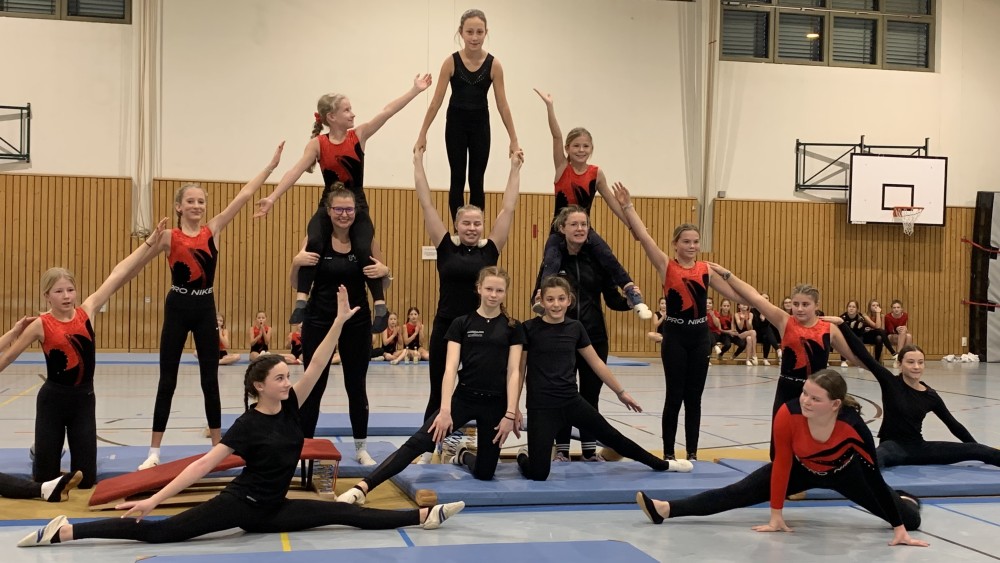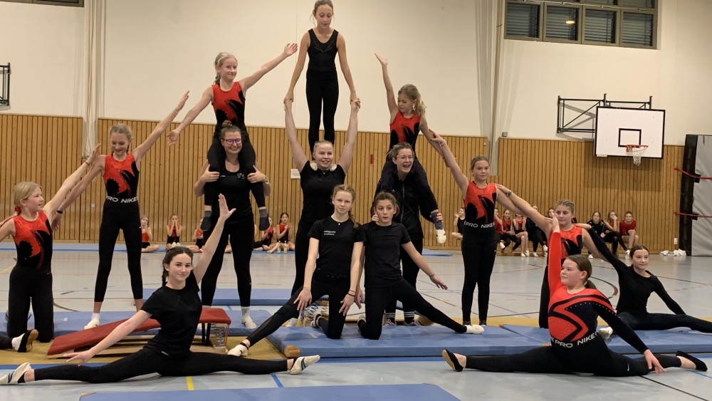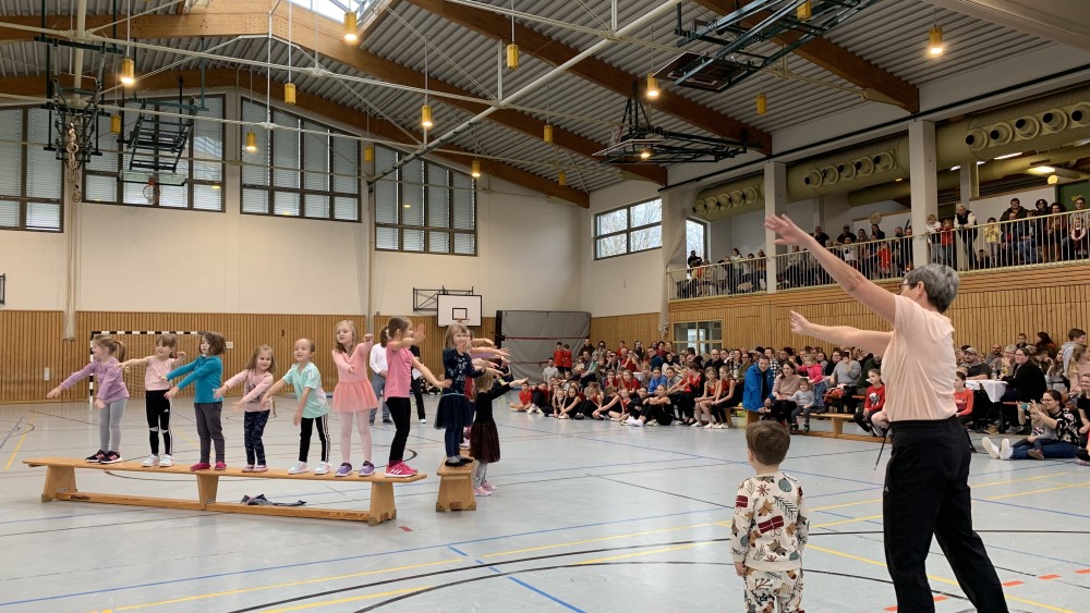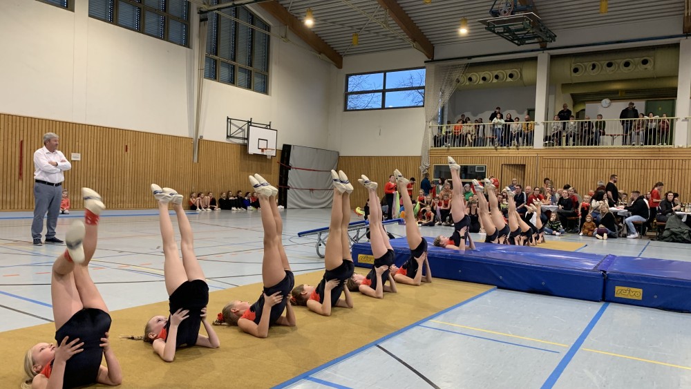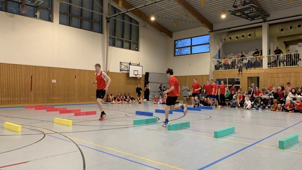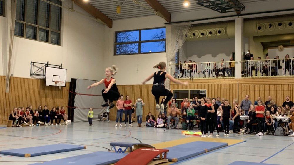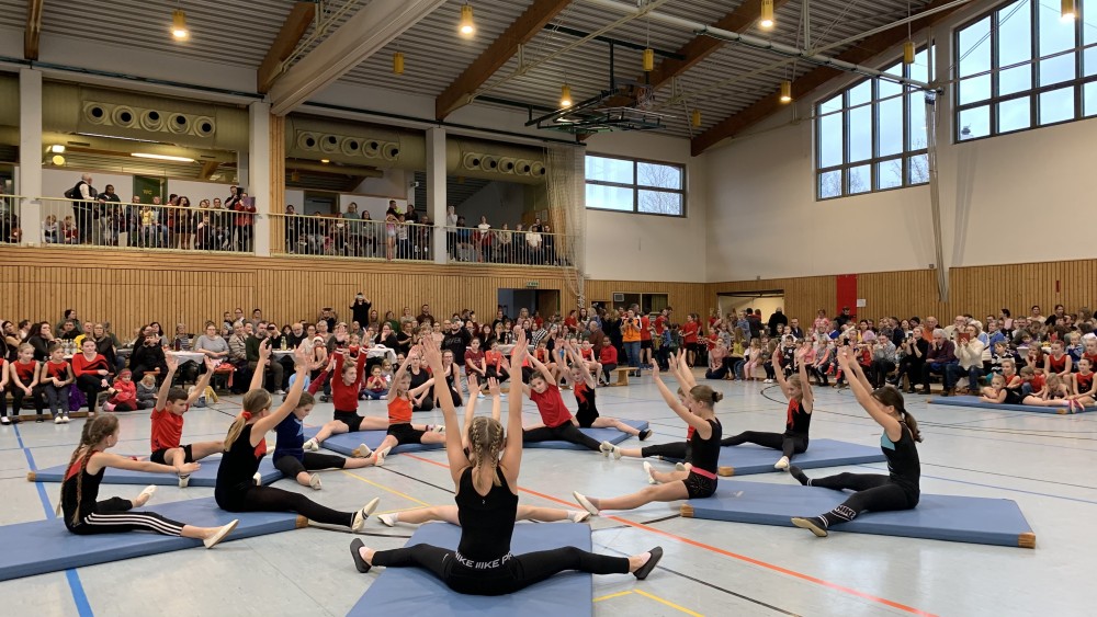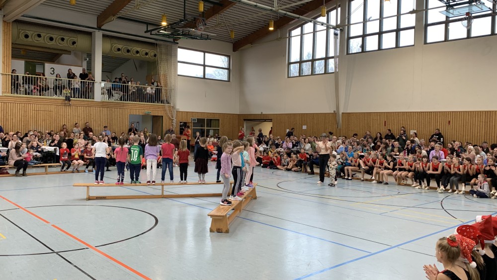 Abwechselnd folgten nun Darbietungen der Kinder- und Jugendlichen der Turnabteilung und der Leichtathleten. Schwungvoll mit fetziger Musik ging es um und auf die Bänke und die Turnerinnen steigerten bei jedem Auftritt ihre Schwierigkeiten. Unter großem Applaus flogen sie mit Flic-Flac und Salto über die das Trampolin und die Matten.